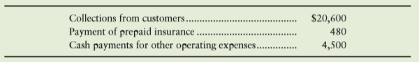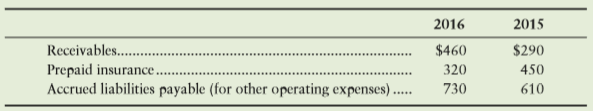 2016 2015 Receivables. . Prepaid insurance. Accrued liabilities payable (for other operating expenses). $460 $290 320 450 730 610 ..... Collections from customers.. Payment of prepaid insurance. Cash payments for other operating expenses. $20,600 480 4,500
