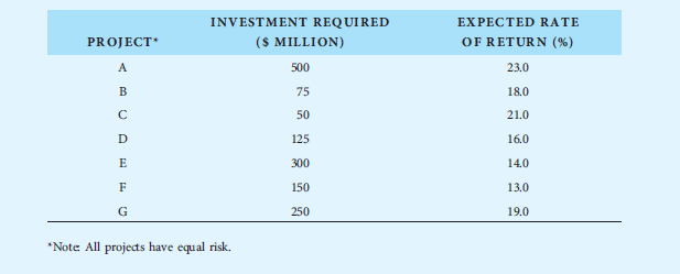 INVESTMENT REQUIRED EXPECTED RAТЕ PROJECT* ($ MILLION) OF RETURN (%) A 500 23.0 В 75 18.0 50 21.0 125 16.0 E 300 14.0 F 150 13.0 G 250 19.0 *Note All projects have equal risk.