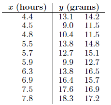 x (hours) 4.4 4.5 y (grams) 14.2 13.1 9.0 11.5 4.8 10.4 11.5 5.5 13.8 14.8 5.7 12.7 15.1 5.9 9.9 12.7 6.3 6.9 13.8 16.4 16.5 15.7 7.5 17.6 16.9 7.8 18.3 17.2