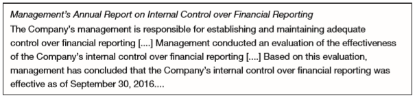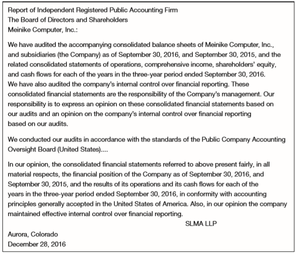 Management's Annual Report on Internal Control over Financial Reporting The Company's management is responsible for establishing and maintaining adequate control over financial reporting [.] Management conducted an evaluation of the effectiveness of the Company's internal control over financial reporting [.] Based on this evaluation, management has concluded that the Company's internal control over financial reporting was effective as of September 30, 2016. Report of Independent Registered Public Accounting Firm The Board of Directors and Shareholders Meinike Computer, Inc.: We have audited the accompanying consolidated balance sheets of Meinike Computer, Inc., and subsidiaries (the Company) as of September 30, 2016, and September 30, 2015, and the related consolidated statements of operations, comprehensive income, shareholders' equity, and cash flows for each of the years in the three-year period ended September 30, 2016. We have also audited the company's internal control over financial reporting. These consolidated financial statements are the responsibility of the Company's management. Our responsibility is to express an opinion on these consolidated financial statements based on our audits and an opinion on the company's internal control over financial reporting based on our audits. We conducted our audits in accordance with the standards of the Public Company Accounting Oversight Board (United States). In our opinion, the consolidated financial statements referred to above present fairly, in all material respects, the financial position of the Company as of September 30, 2016, and September 30, 2015, and the results of its operations and its cash flows for each of the years in the three-year period ended September 30, 2016, in conformity with accounting principles generally accepted in the United States of America. Also, in our opinion the company maintained effective internal control over financial reporting. SLMA LLP Aurora, Colorado December 28, 2016