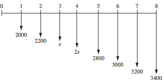 > The future worth in year 8 for the cash flows shown is $20,000. At an interest rate of 10% per year, what is the value, x, of the cash flow in year 4? 0 1 1000 2 1200 3 1400 4 5 1800 6 2000 7 2200 8 2400
