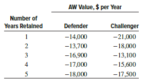 The annual worth values for a defender, which can be replaced with a similar used asset, and a challenger are estimated below. The economic service life of the challenger is