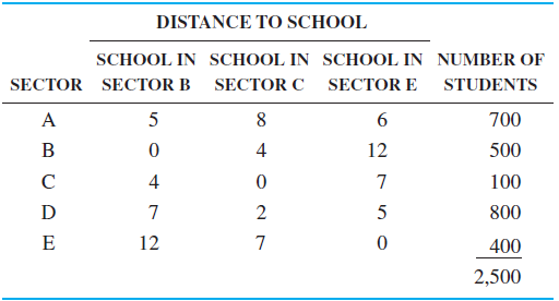 The following table reflects the number of high school- age students living in each sector and the busing distance in miles from each sector to each school: