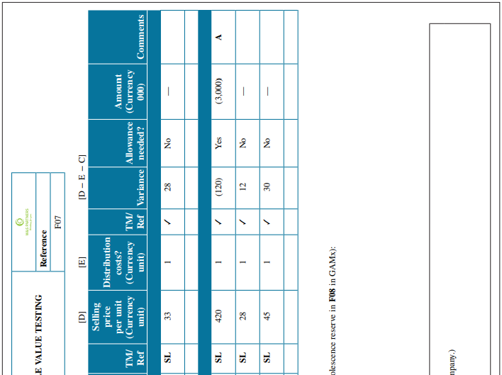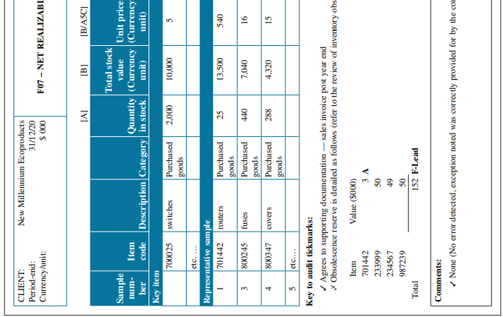 AS RARTNERS LE VALUE TESTING Reference LO (al Selling l5-1-al price Distribution per unit costs? Amount TM/ (Currency (Currency TM/ unit) Allowance (Currency Ref unit) Ref Variance needed? Comments (000 33 IS 87 ON 420 (120) Yes IS (000'E) 12 IS 87 ON 45 IS ON olescence reser ve in F08 in GAMX): mpany.) CLIENT: New Millennium Ecoproducts Period-end: 31/12/20 F07 - NET REALIZABI Currency/unit: 000 S (B/ASC] (al Total stock Unit price Quantity (Currency (Currency unit) Sample value Item -unu code ber Description Category| in stock unit) Key item 700025 switches Purchased 000'7 000'01 spoo8 etc. Representative sample 701442 routers Purchased 25 13,500 spood Purchased 800245 440 7,040 3. 91 səsny spoo8 Purchased 800347 covers 4,320 15 887 spoo8 Key to audit tickmarks: / Agrees to supporting documentation – sales invoice post year end * Obsolescence reserve is detailed as follows (refer to the review of inventory obs Item (000s) ənrA 3 A 701442 666EET 234567 987239 Total 152 F-Lead Comments: * None (No error detected, exception noted was correctly provided for by the cOr