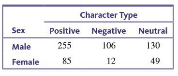 Character Type Sex Positive Negative Neutral Male 255 106 130 Female 85 12 49