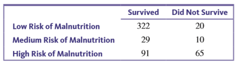 Survived Did Not Survive Low Risk of Malnutrition 322 20 Medium Risk of Malnutrition 29 10 High Risk of Malnutrition 91 65