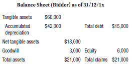 Balance Sheet (Bidder) as of 31/12/1x Tangible assets S60,000 Accumulated $42,000 Total debt $15,000 depreciation Net tangible assets $18,000 Goodwill 3,000 Equity 6,000 Total assets $21,000 Total claims $21,000