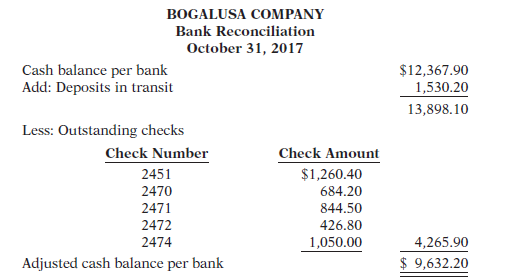 BOGALUSA COMPANY Bank Reconciliation October 31, 2017 Cash balance per bank Add: Deposits in transit $12,367.90 1,530.20 13,898.10 Less: Outstanding checks Check Number Check Amount 2451 $1,260.40 2470 684.20 2471 844.50 2472 426.80 2474 1,050.00 4,265.90 Adjusted cash balance per bank $ 9,632.20 Bank Statement Checks Deposits Date Number Amount Date Amount 11-1 $ 684.20 11-1 $ 1,530.20 2470 11-2 2471 844.50 11-4 1,211.60 1,050.00 1,640.70 2,830.00 11-5 2474 11-8 990.10 11-4 2475 11-13 2,575.00 11-8 2476 11-18 1,472.70 2,945.00 2,567.30 1,650.00 1,186.00 11-21 11-25 11-10 2477 600.00 11-15 2479 1,750.00 1,330.00 11-18 2480 11-28 11-27 2481 695.40 11-30 11-30 2483 575.50 Total $16,127.90 11-29 2486 940.00 Total $12,940.30 Cash Receipts Cash Payments Record Record Date Number Amount Date Number Amount Date Amount $ 575.50 $ 1,211.60 $1,640.70 11-20 2,830.00 11-1 2475 2483 11-3 11-2 2476 11-22 2484 829.50 11-7 990.10 2,575.00 1,472.70 2,954.00 2,567.30 1,650.00 1,186.00 1,304.00 11-2 2477 600.00 11-23 2485 974.80 11-12 538.20 11-17 940.00 398.00 11-4 2478 11-24 2486 11-8 2479 1,705.00 1,330.00 11-29 2487 11-20 11-10 2480 11-30 2488 800.00 11-24 11-15 2481 695.40 Total $14,469.10 11-27 11-18 2482 612.00 11-29 11-30 Total $15,910.70