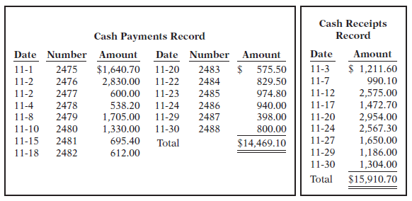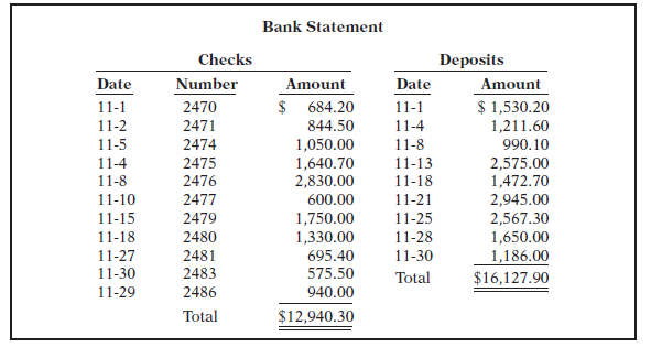 At November 30, the cash balance per books was $11,073.80 and the cash balance per bank statement was $17,712.50. The bank did not make any errors, but Bogalusa Company made two errors.