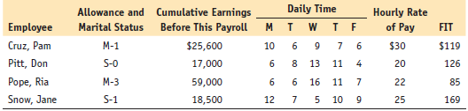 Allowance and Cumulative Earnings Daily Time Hourly Rate Employee Marital Status Before This Payroll M I W of Pay FIT Cruz, Pam M-1 $25,600 10 6 9 7 $30 $119 Pitt, Don S-0 17,000 6 8 13 11 4 20 126 Pope, Ria M-3 59,000 6. 16 11 7 22 85 Snow, Jane S-1 18,500 12 7 5 10 9 25 169