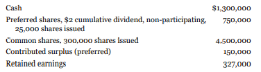 Cash $1,300,000 Preferred shares, $2 cumulative dividend, non-participating, 25,000 shares issued 750,000 Common shares, 300,000 shares issued 4.500,000 Contributed surplus (preferred) Retained earnings 150,000 327,000