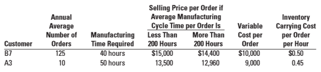 Selling Price per Order if Average Manufacturing Cycle Time per Order Is Annual Average Number of Orders 125 Inventory Carrying Cost per Order per Hour $0.50 Variable Customer B7 Manufacturing Less Than Time Required 40 hours More Than 200 Hours Cost per Order $10,000 200 Hours $15,000 $14,400 12,960 A3 10 50 hours 13,500 9,000 0.45
