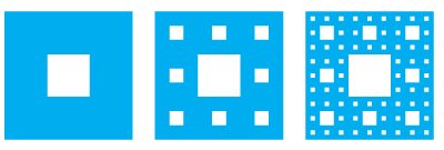 (b). The Sierpinski carpet is a two-dimensional counterpart of the Cantor set. It is constructed by removing the center oneninth of a square of side 1, then removing the centers of the eight smaller remaining squares, and so on. (The figure shows the first three steps of the construction.) Show that the sum of the areas of the removed squares is 1. This implies that the Sierpinski carpet has area 0.