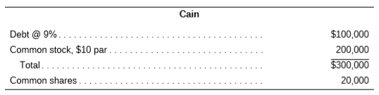 The capital structure for Cain Supplies is presented next. Compute the stock price for Cain if it sells at 19 times earnings per share and EBIT is $50,000. The tax rate is 20 percent.