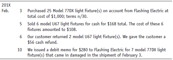 201X 3 Purchased 25 Model 77DX light fixture(s) on account from Flashing Electric at total cost of $1,000; terms n/30. 5 Sold 6 model U67 light fixtures for cash for $168 total. The cost of these 6 fixtures amounted to $108. Feb. 6 Our customer returned 2 model U67 light fixture(s). We gave the customer a $56 cash refund. We issued a debit memo for $280 to Flashing Electric for 7 model 77DX light fixture(s) that came in damaged in the shipment of February 3. 10