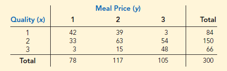 The Chamber of Commerce in a Canadian city has conducted an evaluation of 300 restaurants in its metropolitan area. Each restaurant received a rating on a 3-point scale on typical meal price (1 least expensive to 3 most expensive) and quality (1 lowest quality to 3 greatest quality). A crosstabulation of the rating data is shown below. Forty-two of the restaurants received a rating of 1 on quality and 1 on meal price, 39 of the restaurants received a rating of 1 on quality and 2 on meal price, and so on. Forty-eight of the restaurants received the highest rating of 3 on both quality and meal price.