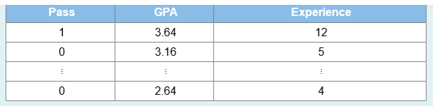 The Chartered Financial Analyst (CFA) designation is fast becoming a requirement for serious investment professionals. Although it requires successfully completing three levels of grueling exams, it also promises great careers with lucrative salaries. Susan Wayne works as a research analyst at Fidelity Investments. She is thinking about taking the CFA exam in the summer and wants to understand why the recent pass rate for Level I has been under 40%. She firmly believes that those who were good students in college have a better chance of passing. She has also been told that work experience helps. She has access to the information on 30 Fidelity employees who took the test last year, including the employeeâs success on the exam (1 for pass, 0 for fail), the employeeâs college GPA, and years of work experience. A portion of the data is shown in the accompanying table.