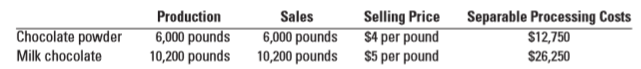 Selling Price S4 per pound $5 per pound Separable Processing Costs $12,750 Production Sales Chocolate powder 6,000 pounds 10,200 pounds 6,000 pounds 10,200 pounds Milk chocolate $26,250