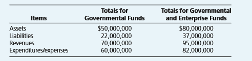 Totals for Totals for Governmental Items Governmental Funds and Enterprise Funds $50,000,000 22,000,000 70,000,000 60,000,000 $80,000,000 37,000,000 95,000,000 82,000,000 Assets Liabilities Revenues Expenditures/expenses Assets Liabilities Revenues $4,100,000 3,900,000 6,700,000 6,500,000 Expenditures