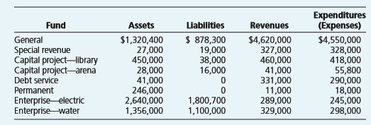 Expenditures (Expenses) Fund Assets Llabilities Revenues General Special revenue Capital project-library Capital project-arena Debt service $1,320,400 27,000 450,000 28,000 41,000 246,000 2,640,000 1,356,000 $ 878,300 19,000 38,000 16,000 $4,620,000 327,000 460,000 41,000 331,000 11,000 289,000 329,000 $4,550,000 328,000 418,000 55,800 290,000 18,000 245,000 298,000 Permanent Enterprise electric Enterprise -water 1,800,700 1,100,000