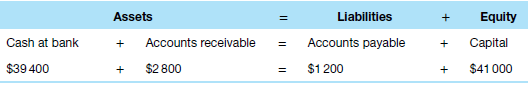 Assets Liabilities Equity Cash at bank Accounts receivable Accounts payable Capital $39 400 $2 800 $1 200 $41 000 + +