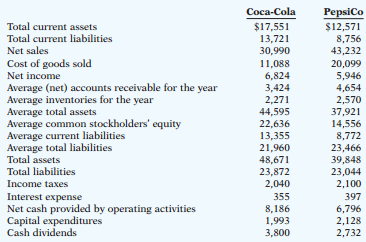 Coca-Cola Pepsico Total current assets Total current liabilities Net sales $17,551 13,721 30,990 $12,571 8,756 43,232 Cost of goods sold 11,088 6,824 3,424 2,271 44,595 22,636 20,099 5,946 4,654 2,570 37,921 14,556 Net income Average (net) accounts receivable for the year Average inventories for the year Average total assets Average common stockholders' equity Average current liabilities Average total liabilities Total assets Total liabilities 13,355 21,960 48,671 23,872 2,040 8,772 23,466 39,848 23,044 2,100 Income taxes Interest expense Net cash provided by operating activities Capital expenditures Cash dividends 397 6,796 2,128 2,732 355 8,186 1,993 3,800