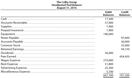The Colby Group Unadjusted Trial Balance August 31, 2016 Debit Balances Credit Balances Cash 17,300 Accounts Receivable. 37,000 Supplies. Prepaid Insurance Equipment.. Notes Payable.. Accounts Payable Common Stock. 7,400 1,900 196,000 97,600 26,000 35,000 Retained Earnings. 94,150 Dividends 56,000 Fees Earned. 454,450 Wages Expense Rent Expense Advertising Expense. Miscellaneous Expense 270,000 51,800 25,200 5,100 667,700 707,200