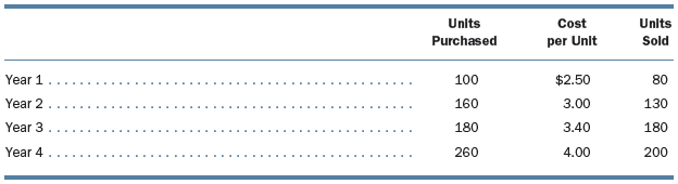 Units Cost Units Purchased per Unit Sold Year 1 100 $2.50 80 Year 2 160 3.00 130 Year 3 180 3.40 180 Year 4 260 4.00 200