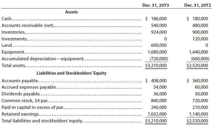 > The comparative balance sheet of Iglesias Inc. for December 31, 20Y3 and 20Y2, is as follows: The income statement for the year ended December 31, 20Y3, is as follows: Additional data obtained from an examination of the accounts in the ledger for 20Y3