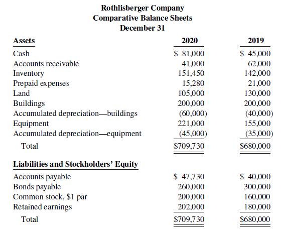 Rothlisberger Company Comparative Balance Sheets December 31 Assets 2020 2019 Cash $ 81,000 $ 45,000 Accounts receivable 41,000 151,450 62,000 Inventory Prepaid expenses Land 142,000 15,280 21,000 105,000 130,000 Buildings Accumulated depreciation-buildings Equipment Accumulated depreciation-equipment 200,000 200,000 (60,000) 221,000 (40,000) 155,000 (45,000) (35,000) Total $709,730 $680,000 Liabilities and Stockholders' Equity $ 47,730 $ 40,000 Accounts payable Bonds payable Common stock, $1 par Retained earnings 260,000 300,000 200,000 160,000 202,000 180,000 Total $709,730 $680,000
