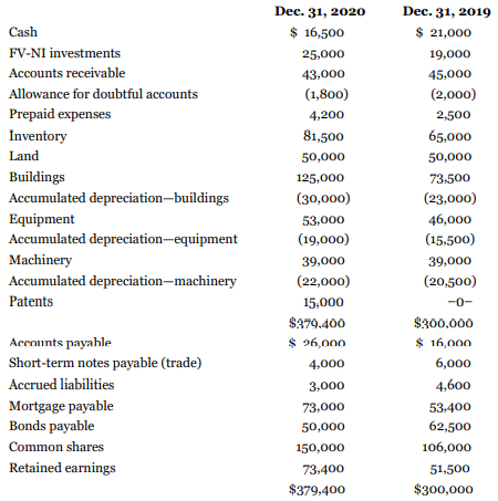 Dec. 31, 2020 Dec. 31, 2019 Cash $ 16,500 $ 21,000 FV-NI investments 25,000 19,000 Accounts receivable 43,000 45,000 Allowance for doubtful accounts (1,800) (2,000) Prepaid expenses 4,200 2,500 Inventory 81,500 65,000 Land 50,000 50,000 Buildings Accumulated depreciation-buildings 125,000 73.500 (30,000) (23,000) Equipment Accumulated depreciation-equipment 53,000 46,000 (19,000) (15.500) Machinery 39,000 39,000 Accumulated depreciation-machinery (22,000) (20,500) Patents 15,000 -0- $379.400 $300,000 Accounts payahle $ 96,000 $ 16,000 Short-term notes payable (trade) 4,000 6,000 Accrued liabilities 3,000 4,600 Mortgage payable Bonds payable 73,000 53.400 50,000 62,500 Common shares 150,000 106,000 Retained earnings 73,400 51,500 $379,400 $300,000