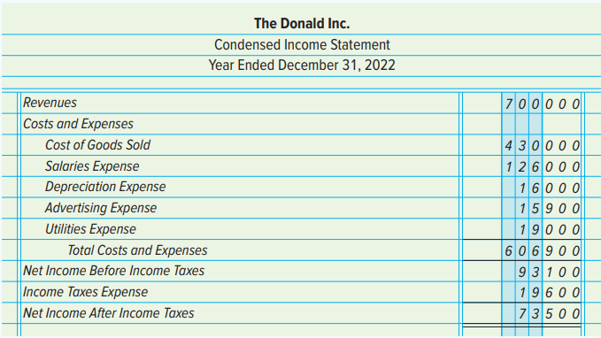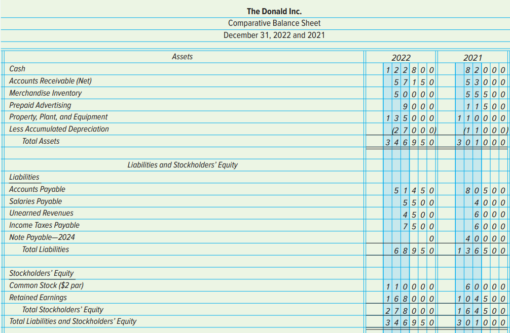 The condensed income statement and comparative balance sheet of The Donald Inc. as of December 31, 2022 and 2021, are provided below. Other financial data are also given.