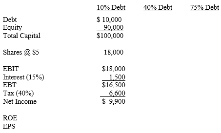 10% Debt $ 10,000 90,000 $100,000 40% Debt 75% Debt Debt Equity Total Capital Shares @ $5 18,000 $18,000 1,500 $16,500 6,600 $ 9,900 EBIT Interest (15%) EBT Таx (40%) Net Income ROE EPS