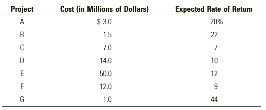 Project Cost (in Millions of Dollars) Expected Rate of Return A $ 3.0 20% В 1.5 22 C 7.0 7 14.0 10 E 50.0 12 12.0 G 1.0 44