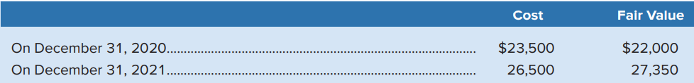 > Pacific Fishing Inc.’s actively traded non-strategic investments as of December 31, 2020, are as follows: Pacific Fishing Inc. had no investments prior to 2020. Required 1. Prepare the fair value adjustment at December 31, 2020, based o