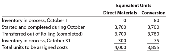 The beginning work in process inventory on October 1 had a cost of $163,800. Determine the cost of completed and transferred-out production, the ending work in process inventory, and the total costs assigned by the Rolling Department.