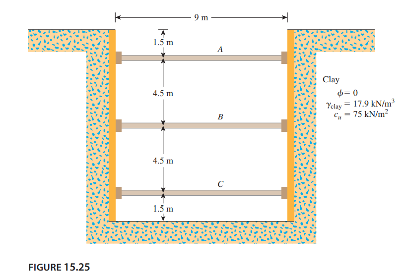 The cross section of a braced cut supporting a sheet pile installation in a clay soil is shown in Figure 15.25. Given: H = 12 m, ï§clay = 17.9 kN/m3 , ï¦ = 0, c = 75 kN/m2 , and the center-to-center spacing of struts in plan view, ï³ = 3 m.
