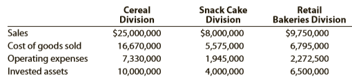 Cereal Division Snack Cake Division Retail Bakeries Division Sales $25,000,000 $8,000,000 $9,750,000 Cost of goods sold Operating expenses Invested assets 16,670,000 5,575,000 6,795,000 7,330,000 1,945,000 2,272,500 10,000,000 4,000,000 6,500,000