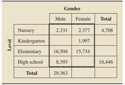The Current Population Survey from the U.S. Census Bureau provides data on school enrollment. The following contingency table shows school enrollment below postsecondary, in thousands, by level and gender.
