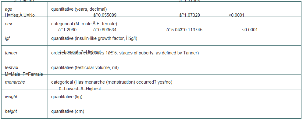 The data set Igf contains measurements on people of various ages. The main variable of interest is the level of insulin-like growth factor (igÃâ) (J. Clin. Endocrinol. Metab. 78(3): 744752, March 1994). Each row in the data set corresponds to one individual. Data were collected on these variables: