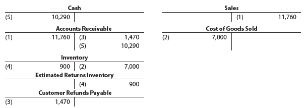 Cash Sales (1) Cost of Goods Sold 7,000 (5) 10,290 11,760 Accounts Receivable (1) 11,760 (3) 1,470 (2) (5) 10,290 Inventory 900 (2) Estimated Returns Inventory (4) 7,000 (4) 900 Customer Refunds Payable (3) 1,470