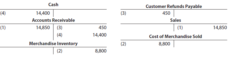 The debits and credits for four related entries for a sale of $15,000, terms 1/10, n/30, are presented in the following T accounts. Describe each transaction.