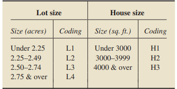 The document Arizona Residential Property Valuation System, published by the Arizona Department of Revenue, describes how county assessors use computerized systems to value single-family residential properties for property tax purposes. On the WeissStats site are data on lot size (in acres) and house size (in square feet) for homes in the Yakashba Estates, a private community in Prescott, AZ. We used the following codings for lot size and home size.