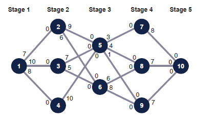 Stage 5 (at node 10) is the distribution center in which final products are stored. Although each node represents a different plant, plants at the same stage perform the same operation. (For exam- ple, at stage 2 of the manufacturing process, plants 2, 3, and 4 all perform the same manufactur- ing operation.) The values accompanying the branches emanating from each node indicate the maximum number of units (in thousands) that a particular plant can produce and ship to another plant at the next stage. (For example, plant 3 has the capacity to process and ship 7,000 units of the product to plant 5.) Determine the maximum number of units that can be processed through the five-stage manufacturing process and the number of units processed at each plant.