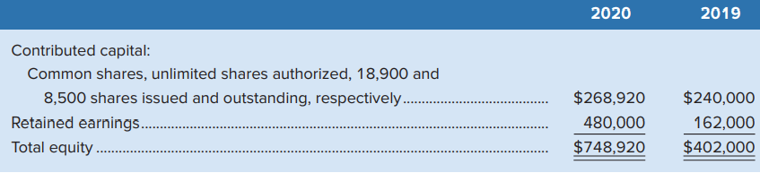 > Ozzi Development Inc. showed the following equity account balances on the December 31, 2019, balance sheet: Common shares, unlimited authorized shares, 660,000 shares issued and outstanding = $3,960,000 Retained earnings = 2,030,000 During 2020, the foll