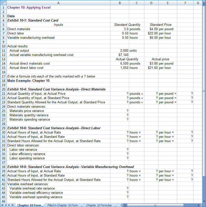 1. Check your worksheet by changing the direct materials standard quantity in cell B6 to 2.9 pounds, the direct labor standard quantity in cell B7 to 0.6 hours, and the variable manufacturing overhead in cell B8 to 0.6 hours. The materials spending variance should now be $1,500 U, the labor spending variance should now be $3,720 F, and the variable overhead spending variance should now be $60 F. If you do not get these answers, find the errors in your worksheet and correct them.