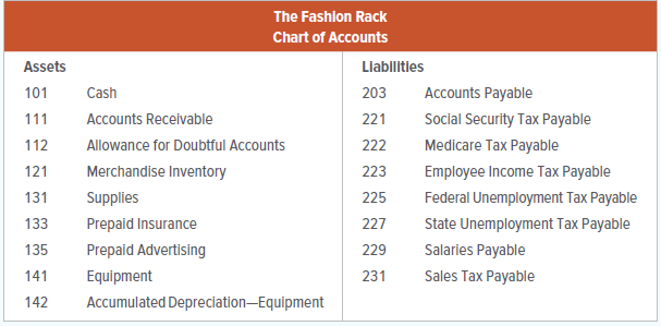 The Fashion Rack has a monthly accounting period. The firmâs chart of accounts is shown below. All transactions are recorded in a general journal. Postings are made from the general journal to the accounts receivable ledger, accounts payable ledger, and general ledger. The employees are paid at the end of the month. A computerized payroll service prepares all payroll records and checks.