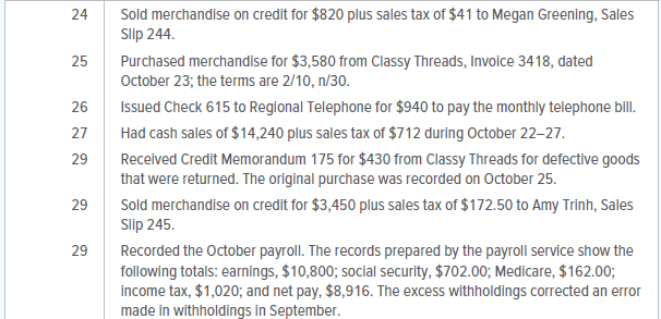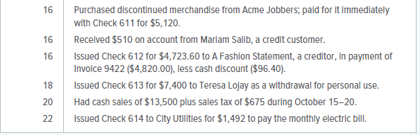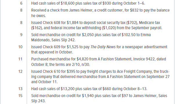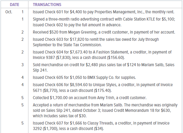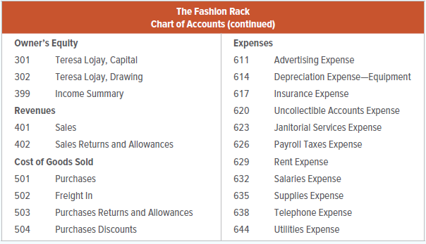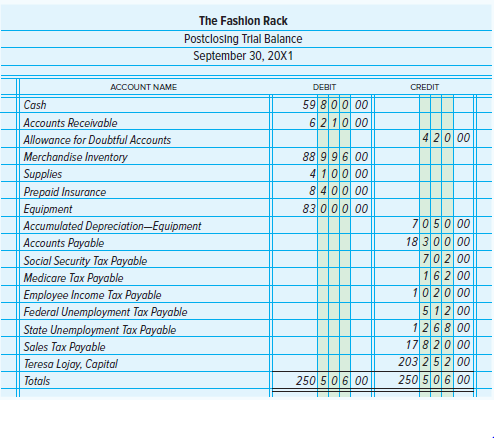 The Fashion Rack is a retail merchandising business that sells brand-name clothing at discount prices. The firm is owned and managed by Teresa Lojay, who started the business on April 1, 20X1. This project will give you an opportunity to put your knowledge of accounting into practice as you handle the accounting work of The Fashion Rack during the month of October 20X1.