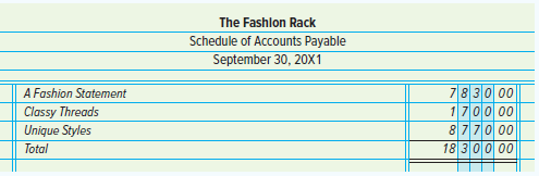 2. Open the subsidiary ledger accounts and enter the balances for October 1, 20X1. Obtain the necessary figures from the schedule of accounts payable and schedule of accounts receivable prepared on September 30, 20X1, which appears below. (If you are using the Study Guide & Working Papers, you will find that the subsidiary ledger accounts are already open.)