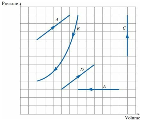 The figure shows PV diagrams for five systems as they undergo various thermodynamic processes. Rank them in order of the work done on the system, from greatest to least. Rank positive work higher than negative work.